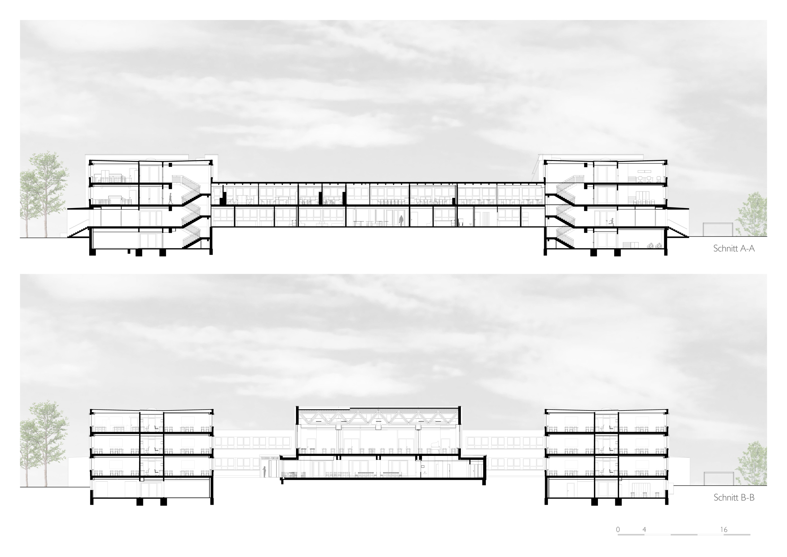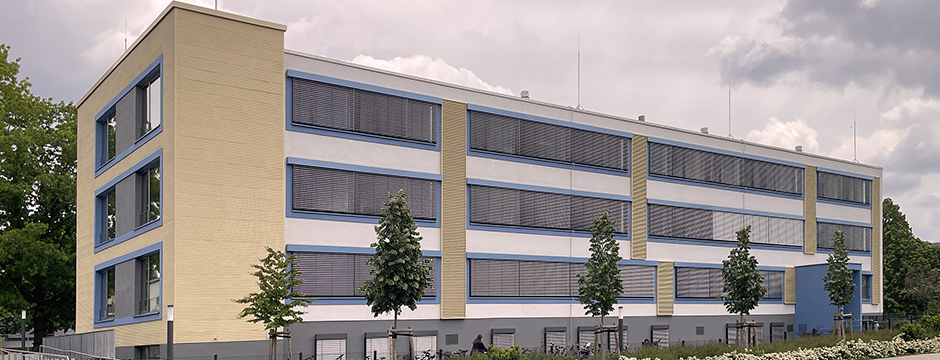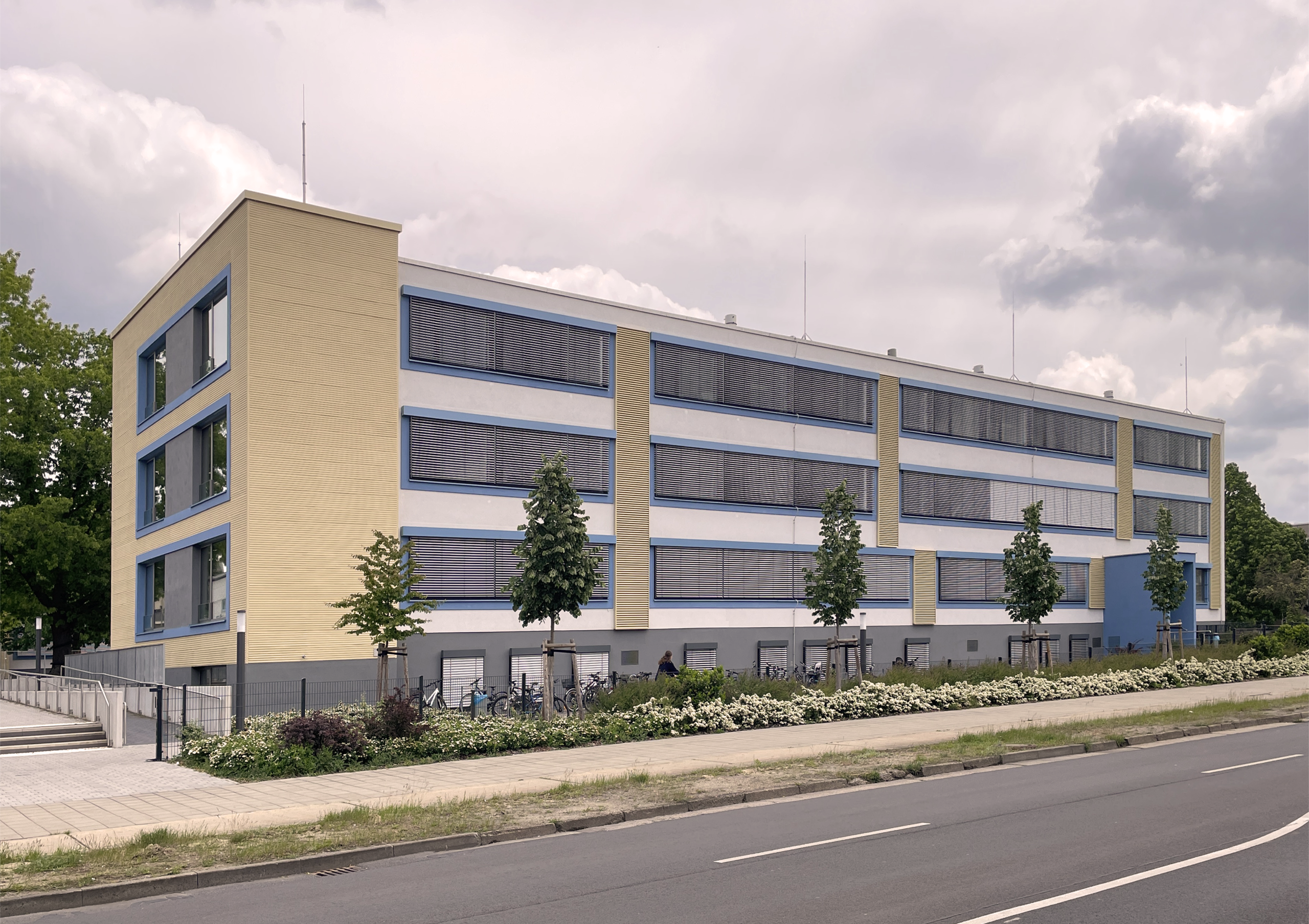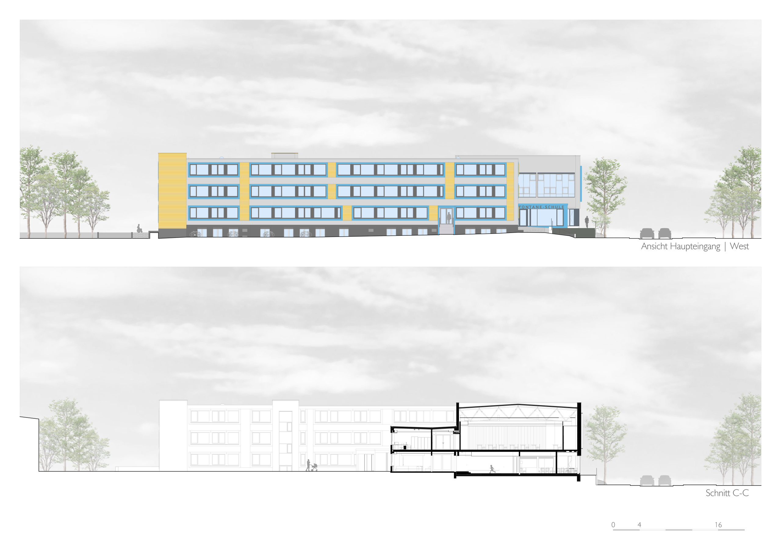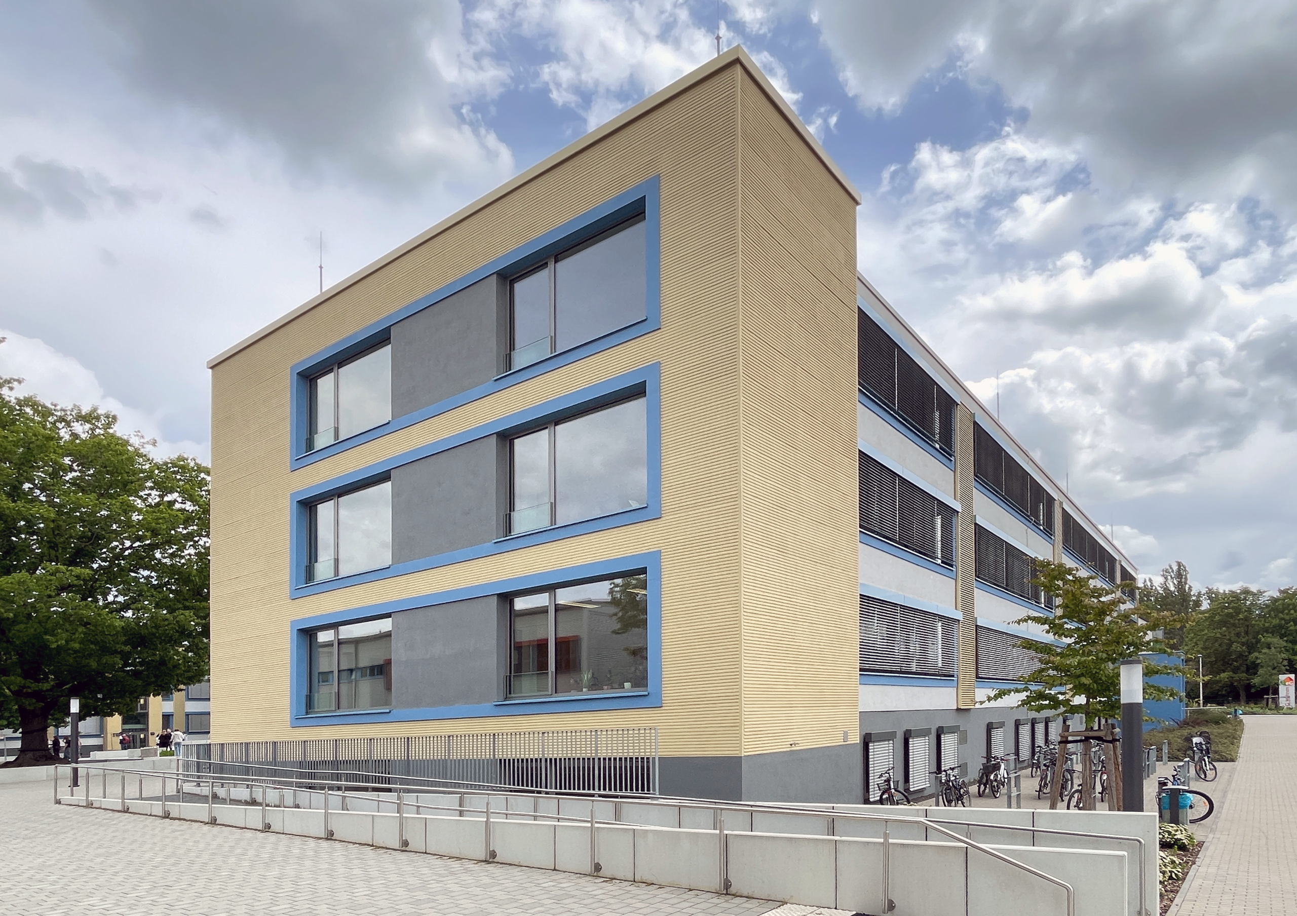 Während die Obergeschosse nun Raum für Fachbereiche und Fachkabinette bieten, nehmen die Untergeschosse unter anderem Musik-, Proben- und Fitnessräume auf. Ergänzende Anbauten setzen zudem gezielte architektonische Akzente im gesamten Ensemble. Abschließend wurde auch der Schulhof unter Erhalt des wertvollen Baumbestands neugestaltet und vollständig barrierefrei erschlossen.