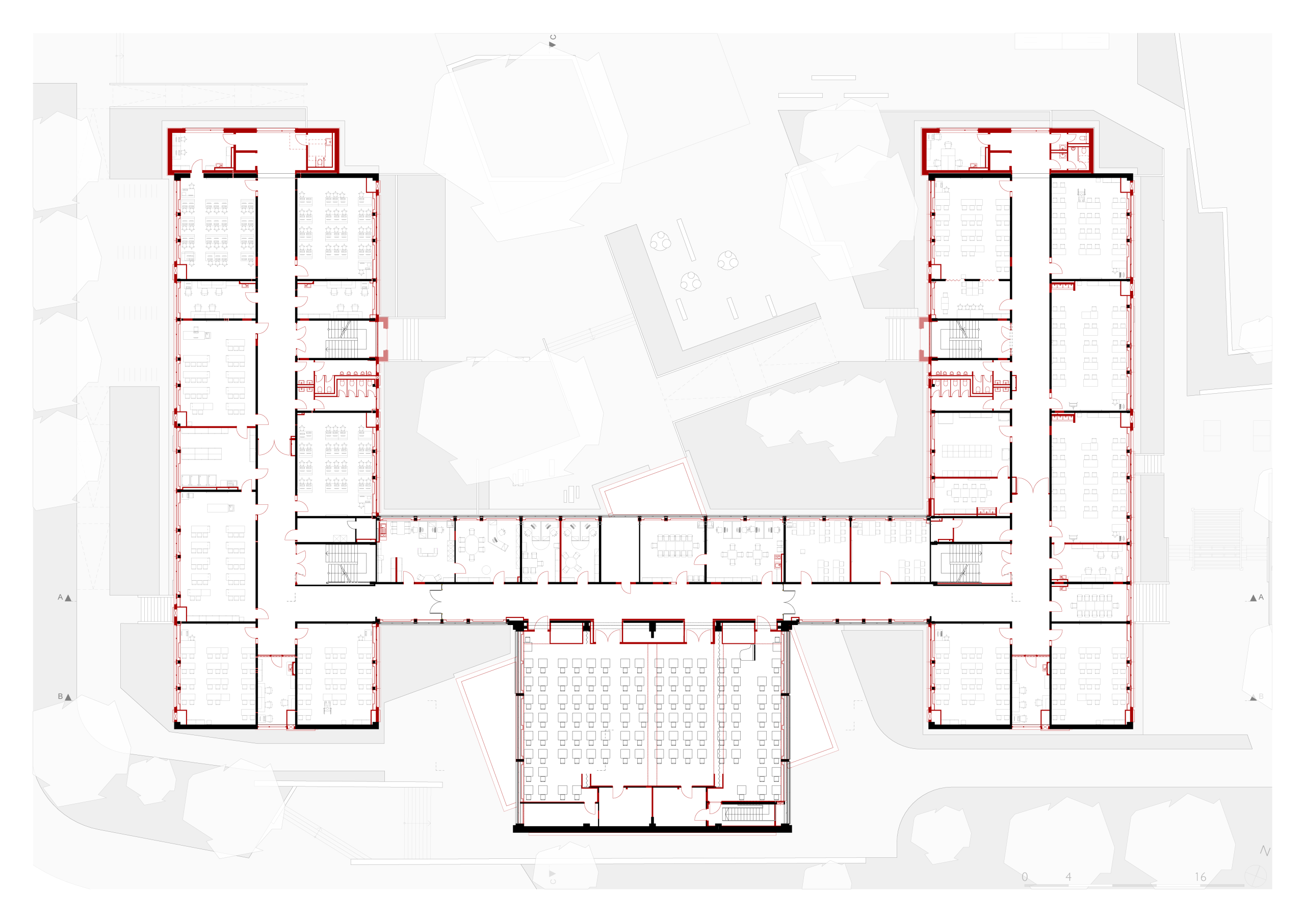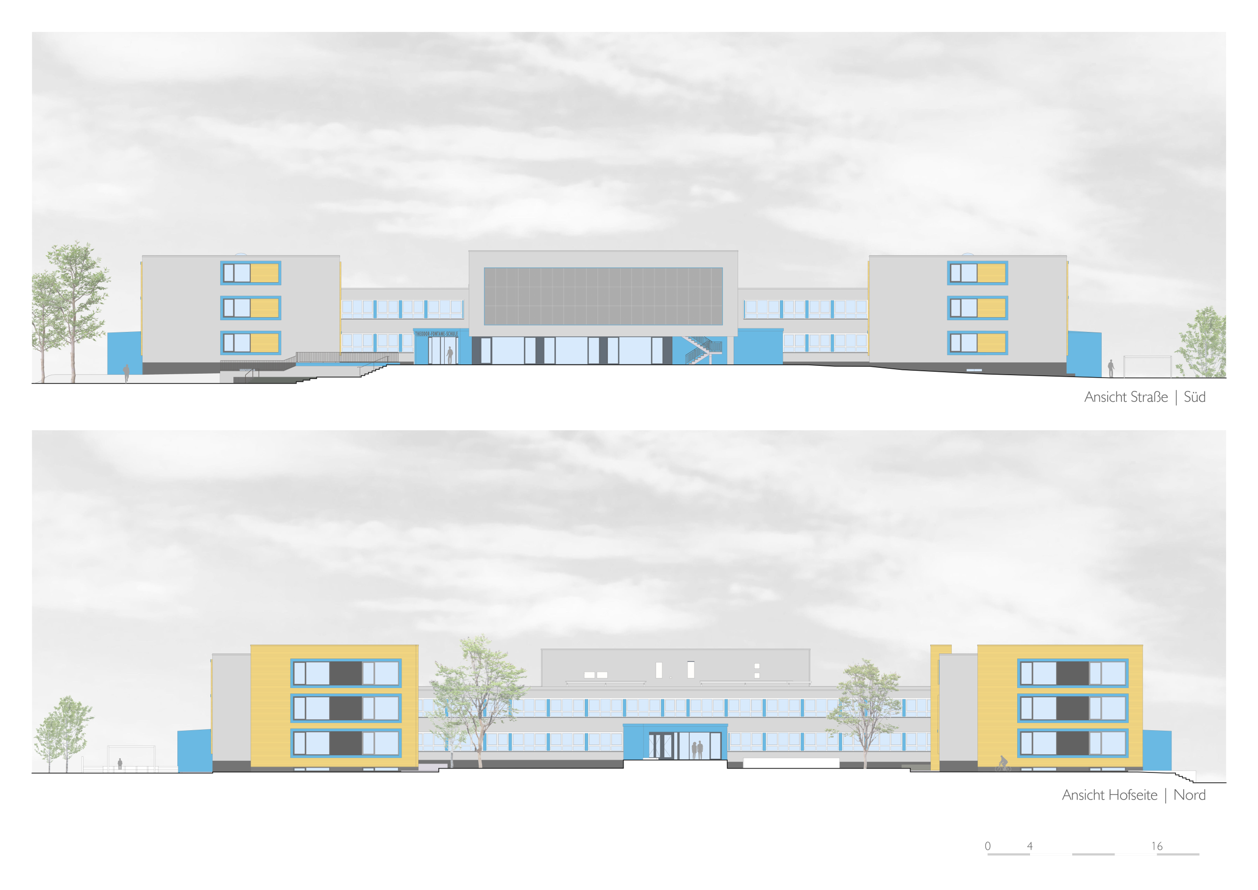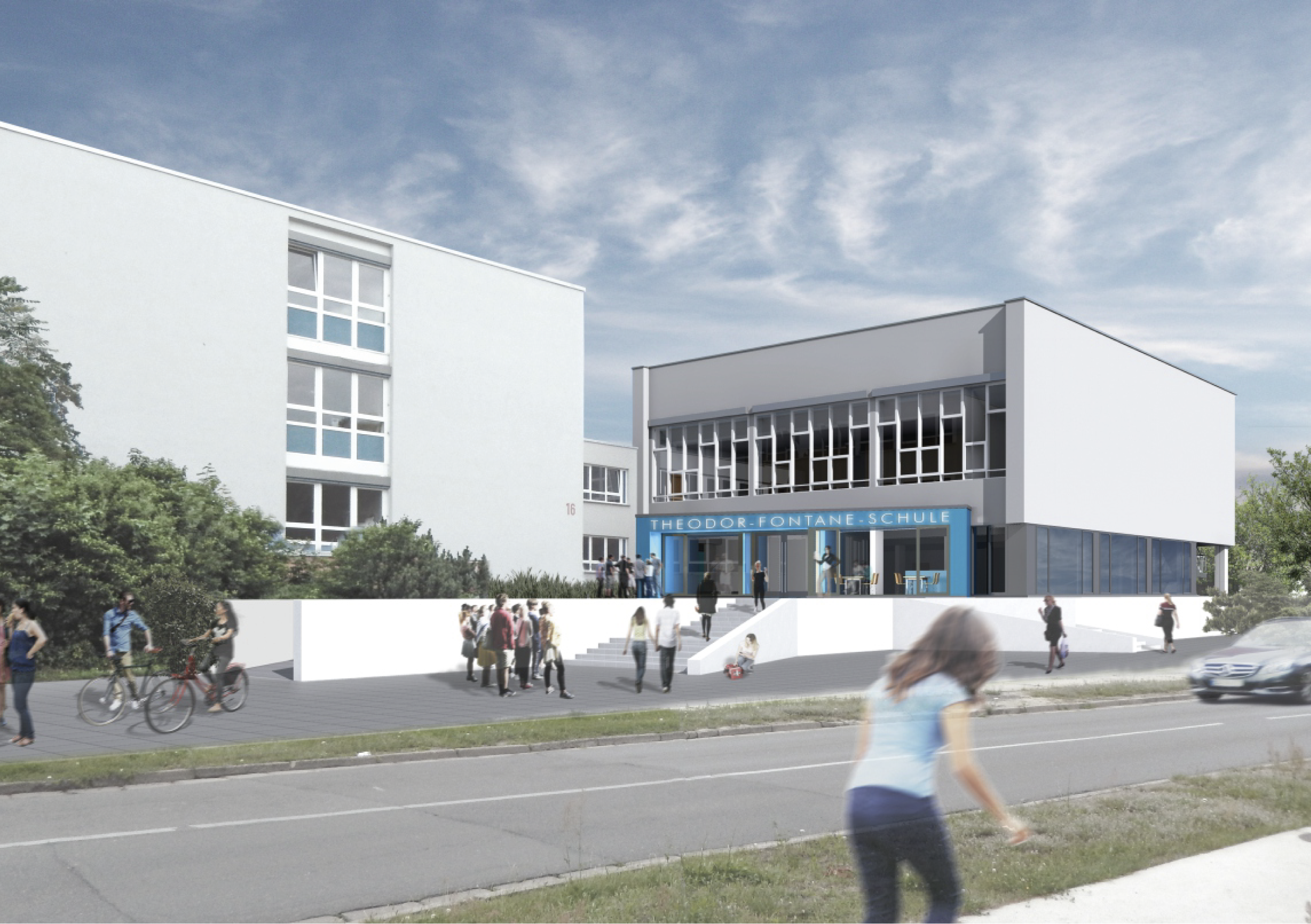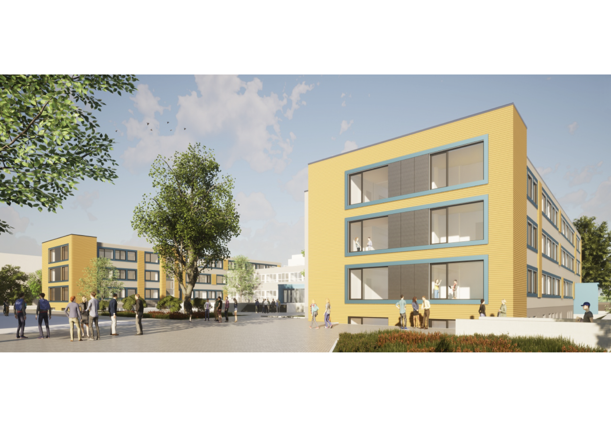Während die Obergeschosse nun Raum für Fachbereiche und Fachkabinette bieten, nehmen die Untergeschosse unter anderem Musik-, Proben- und Fitnessräume auf. Ergänzende Anbauten setzen zudem gezielte architektonische Akzente im gesamten Ensemble. Abschließend wurde auch der Schulhof unter Erhalt des wertvollen Baumbestands neugestaltet und vollständig barrierefrei erschlossen.