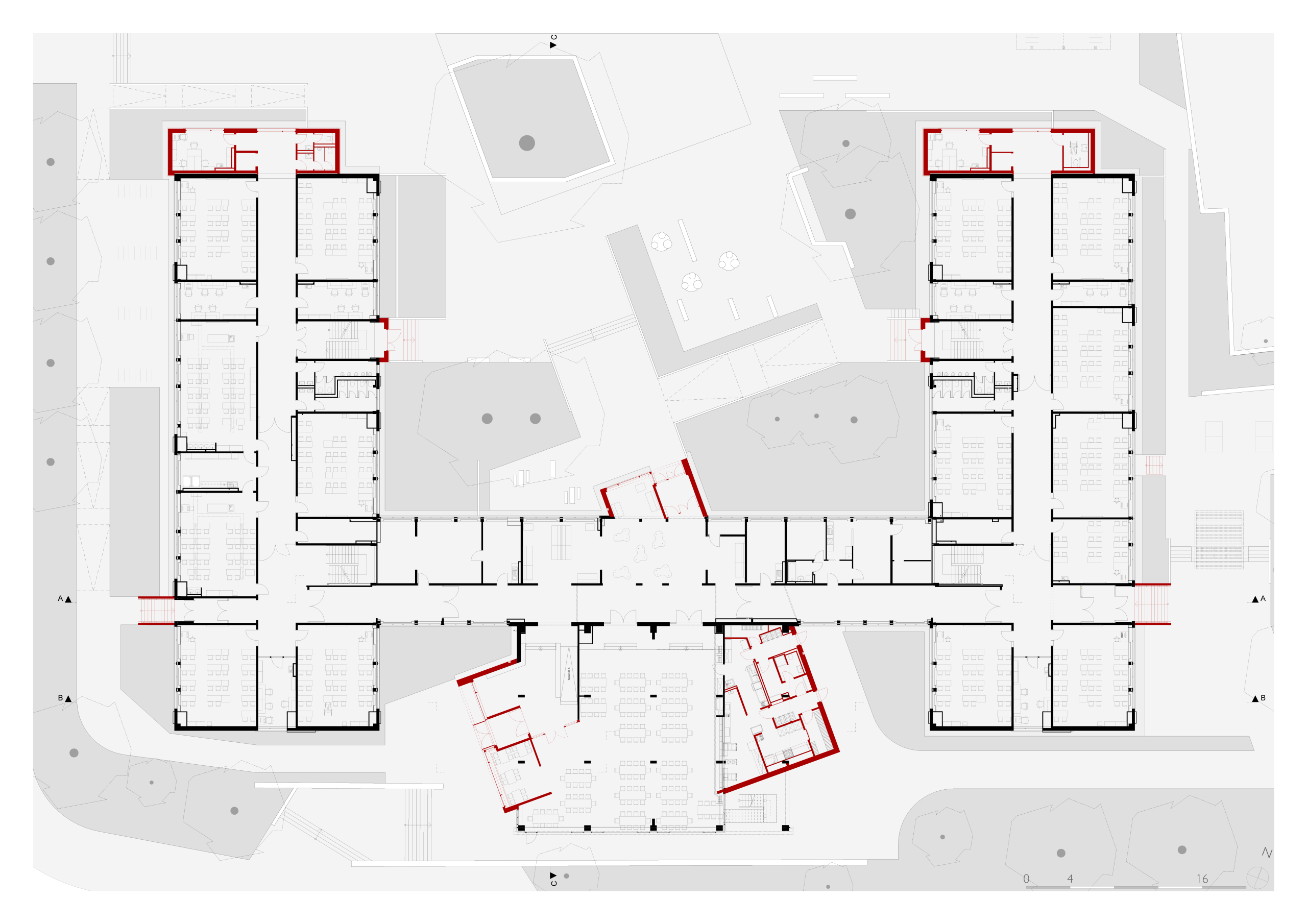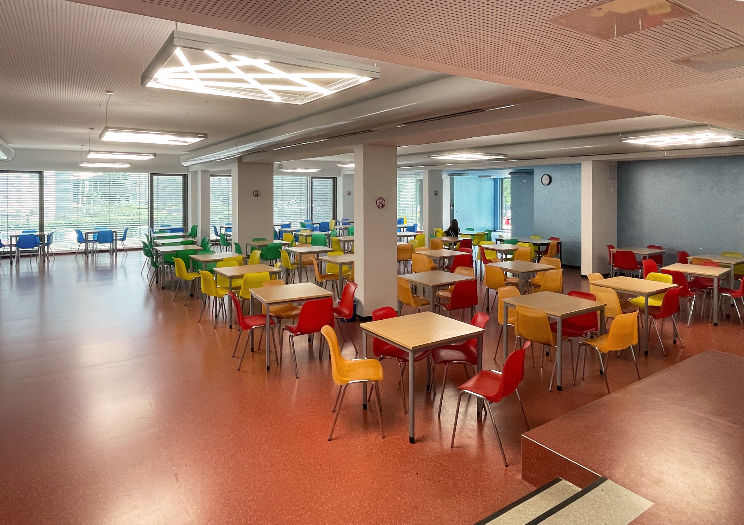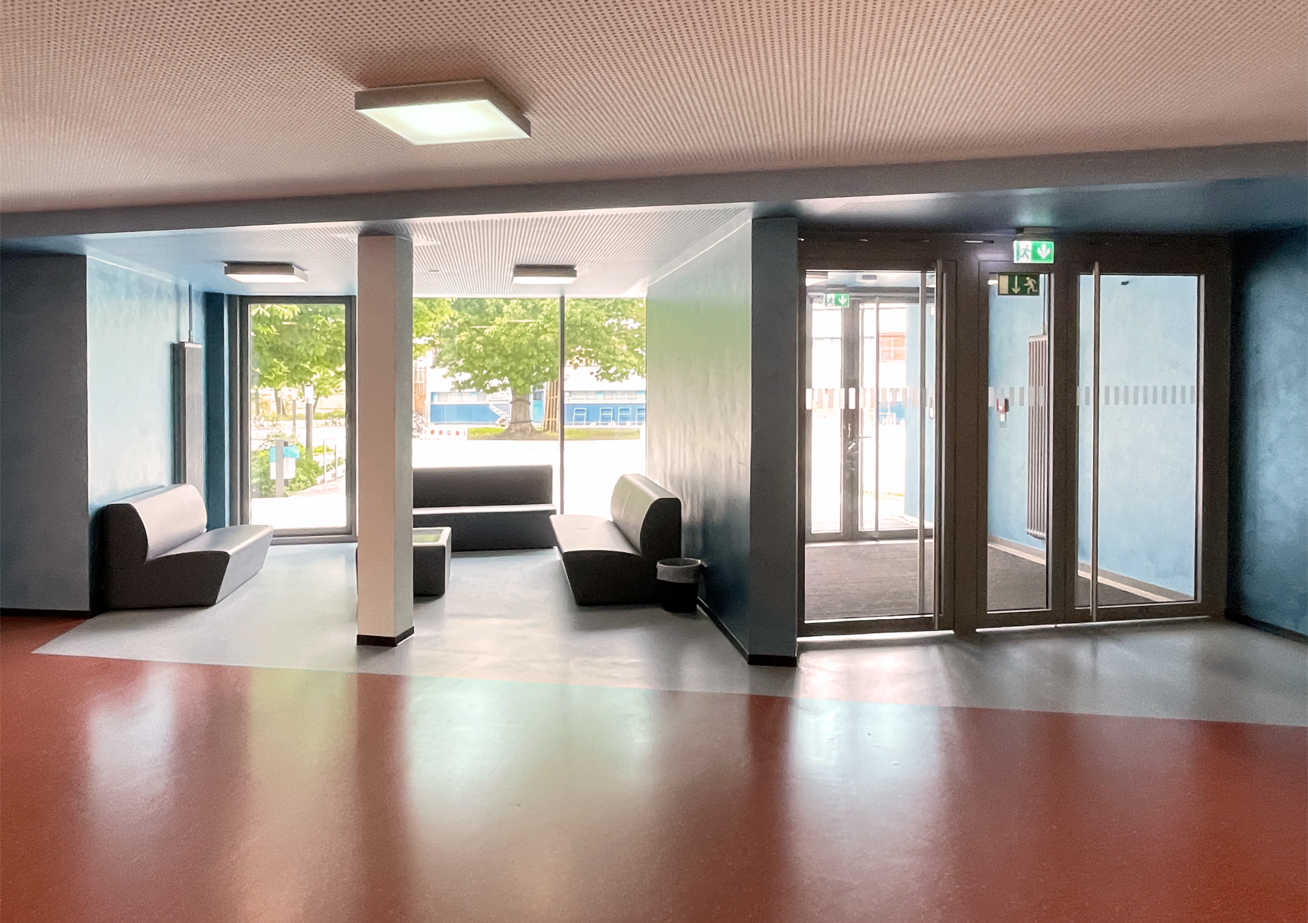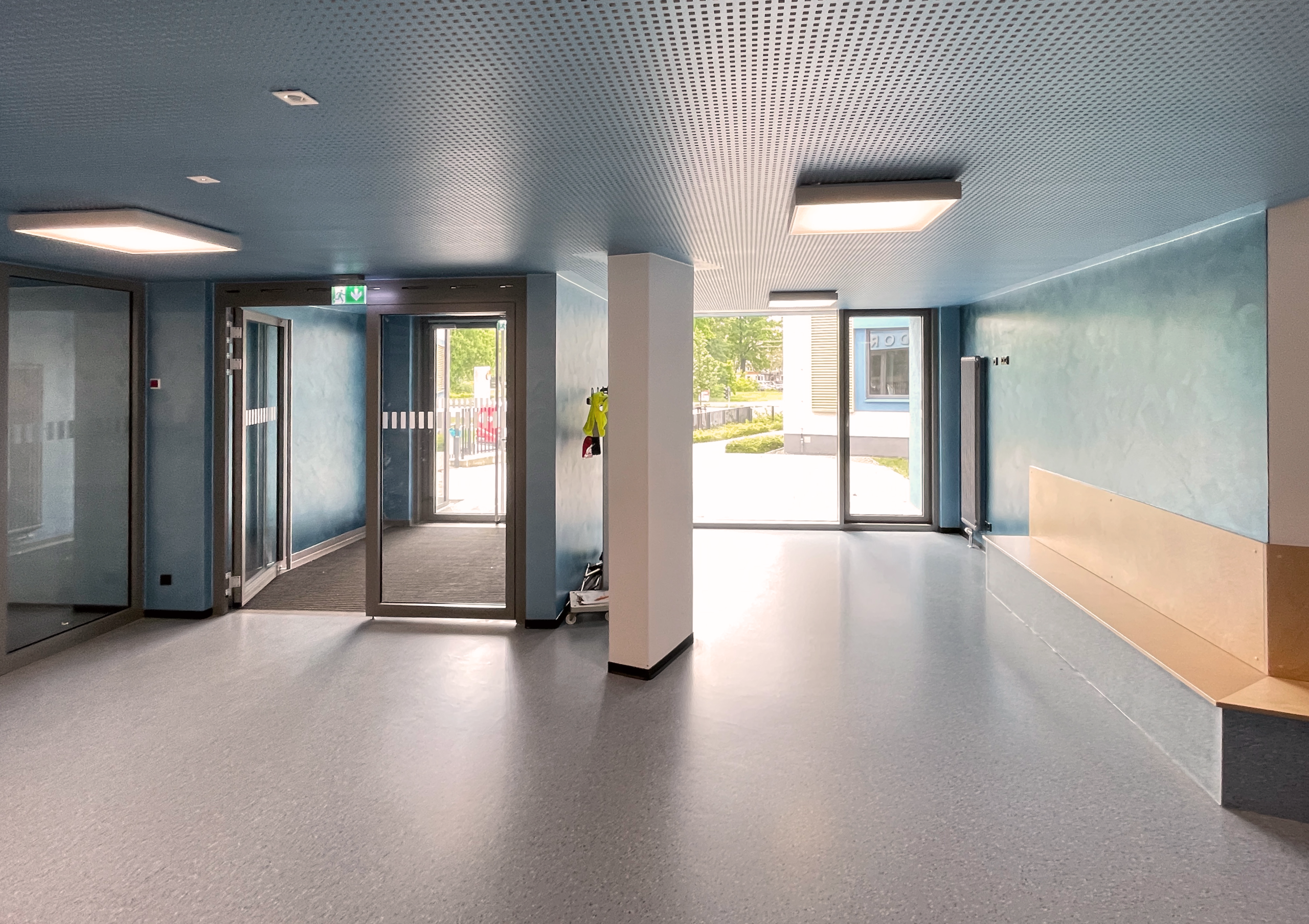 Im Zuge des ersten Bauabschnitts erfolgten wesentliche Eingriffe in den Verbindungsbau. Der ursprünglich offene Aulabau wurde im Erdgeschoss geschlossen, wodurch wertvolle Räume für den Speiseraum, die Küche und einen zentralen Eingang entstanden sind. Die neu geschaffene Eingangshalle bildet nun das räumliche Zentrum und verknüpft die verschiedenen Gebäudeteile miteinander. In diesem Bereich wurden zudem die Verwaltung, das Lehrerzimmer und der Konferenzraum konzentriert. Die Aula blieb als multifunktionaler Raum mit flexibler Nutzung erhalten und verfügt nun über eine integrierte Zubereitungsküche.